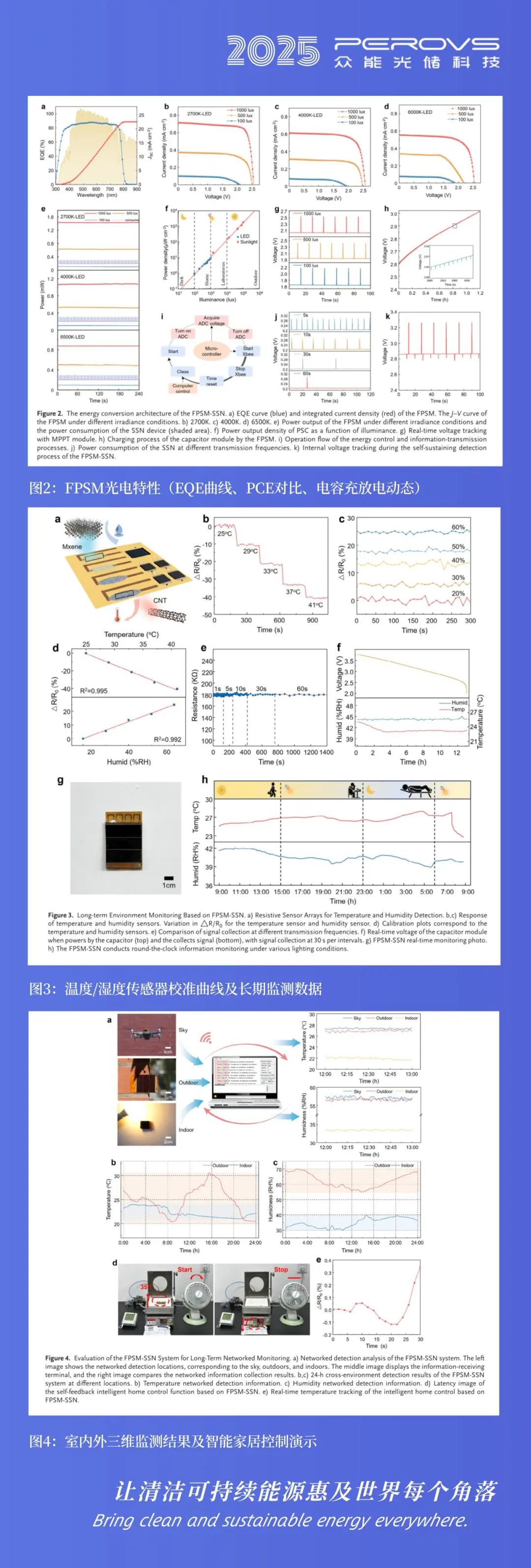 宽辐照:钙钛矿材料因其可调带隙和高吸收系数而脱颖而出,使其成为适用于各种辐照条件的理想选择,柔性钙钛矿太阳能电池模块(FPSM)能够有效适应从昏暗室内环境(100 lux)到专业实验室条件(2000 lux)及户外环境(10 000 lux)的多样化光照场景。与传统晶硅太阳能电池相比,钙钛矿太阳能电池在低光强室内环境中表现出更优的功率转换效率,即使在 100 lux的昏暗室内光照下也能保障电量不间断运行,解决了传统物联网节点在低光环境下能量获取不足的问题。